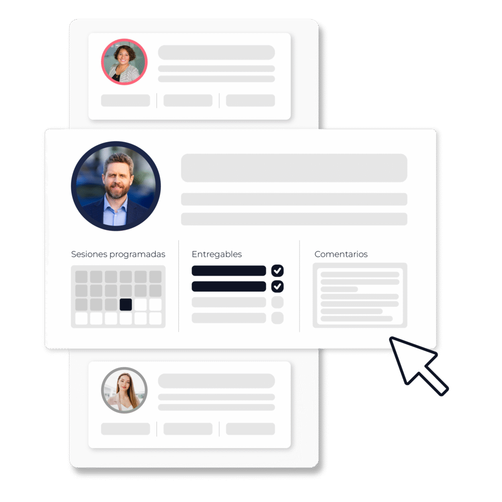 Accede a reportes de avance por participante, sesiones programadas, entregables y comentarios, todo desde un solo lugar y con trazabilidad total.